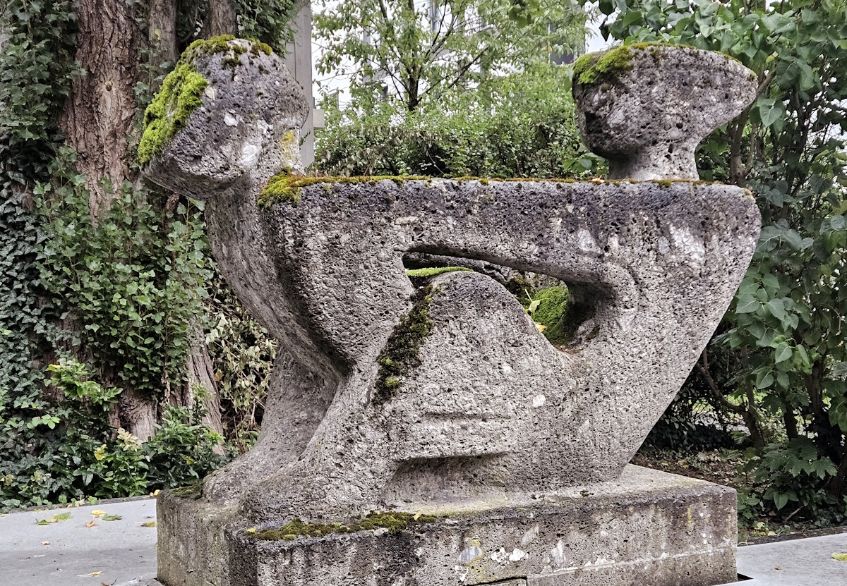 Ein kleines Mädchen bietet einem Greis eine Blume an. »Begegnung der Generationen« heißt die 2017 von Steffen Schuster* (*1964) gestaltete Gruppe von Schmolchen an der Passauerstraße 118. Schmolche des Künstlers aus Baldham gibt es auch zum Beispiel in → Riem.