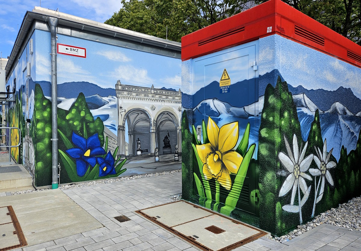 Im Oktober 2021 begann die Bahn, das Relais-Stellwerk am Ostbahnhof aus dem Jahr 1971 durch ein elektronisches zu ersetzen. Mit zwei Jahren Verspätung gegenüber der ursprünglichen Planung konnte die neue, 195 Millionen Euro teure Anlage im Juni 2025 in Betrieb genommen werden. Marcus Dörr (Graffiti-Agentur artmos4, Offenbach) besprühte dann nicht nur das Stellwerk, sondern insgesamt 26 größere und kleinere Bahngebäude entlang der Friedenstraße 23 – 43 mit Münchner Motiven. Zwei-, dreitausend Dosen Farbe verteilte er dabei auf 1500 Quadratmetern.