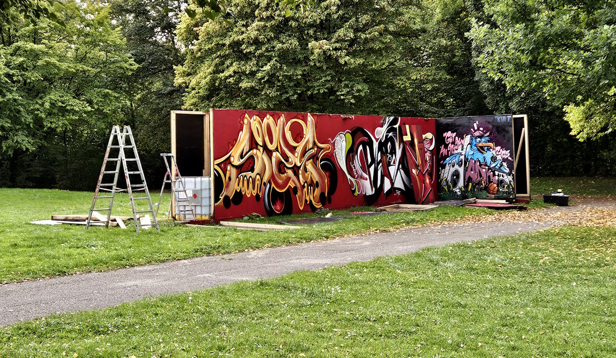 Ein 2018 im Biedersteiner Freizeitpark über dem Biedersteiner Tunnel im Stadtbezirk Schwabing-Freimann aufgestellter Container mit der Steuerung der Tunneltechnik wurde 2023 bunt besprüht.