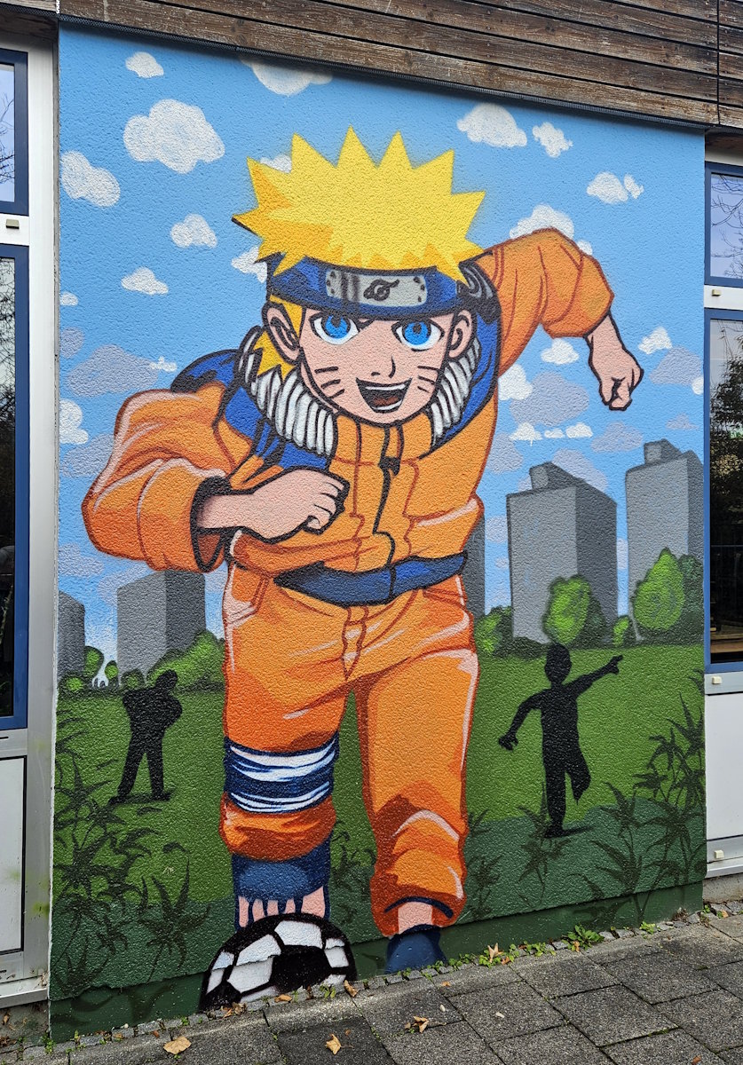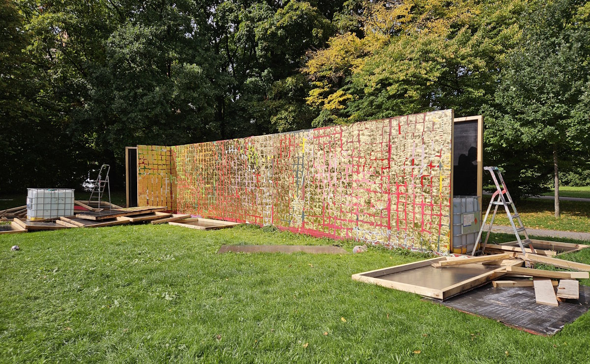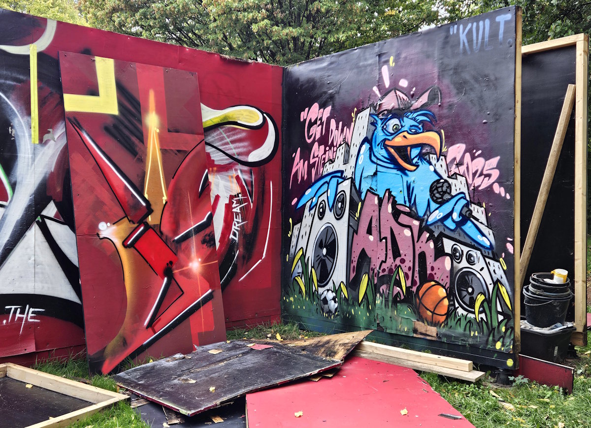 Unter der Bezeichnung »Muralarum« (Akronym!) initiiert der Künstler Nico Kiese (*1983) an mehreren Orten in München Streetart-Projekte. Das 2023 aus Holz gefertigte »Muralarum« in der Grünanlage parallel zum Karl-Marx-Ring in Neuperlach wurde zwei Jahre lang immer wieder neu bemalt bzw. besprüht ‒ bis die Genehmigung Ende September 2025 ablief.