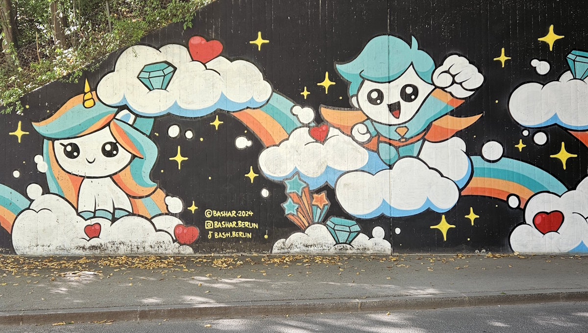 Viktor Höricht und Justus Körtgen hatten beide die Fachoberschule in Unterschleißheim mit der Fachrichtung Gestaltung abgeschlossen. 2021 besprühten der 21-jährige Kunst- und der ein Jahr ältere Architekturstudent die Betonwände der Fußgänger- und Radlerrampen im Norden des S-Bahnhofs Unterschleißheim, und im Jahr darauf folgten die auf der Südseite. So entstanden mehrere hundert Meter lange bunte Märchenwelten.