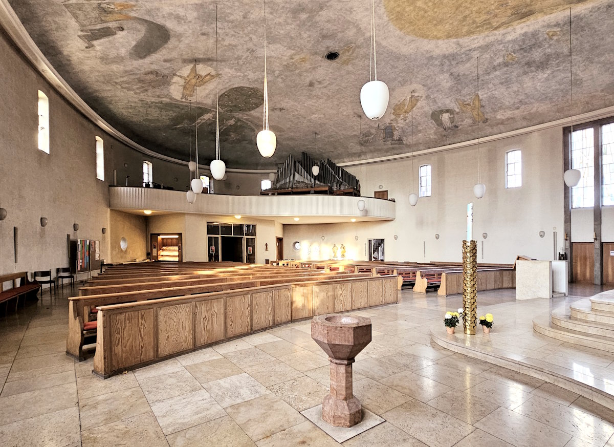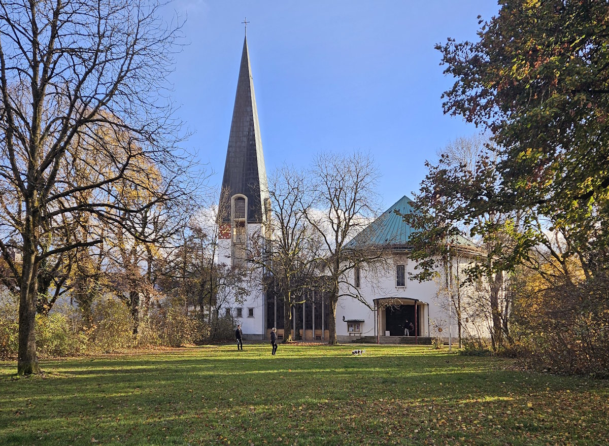 An der Wohnanlage zwischen Ratzingerplatz, Aidenbachstraße, Tulpenweg und Steinmetzstraße fallen Wandgemälde auf, dazu Figurenschmuck an den beiden Toren am Ratzingerplatz – und Kleingärten bei den Garagen im Innenhof.