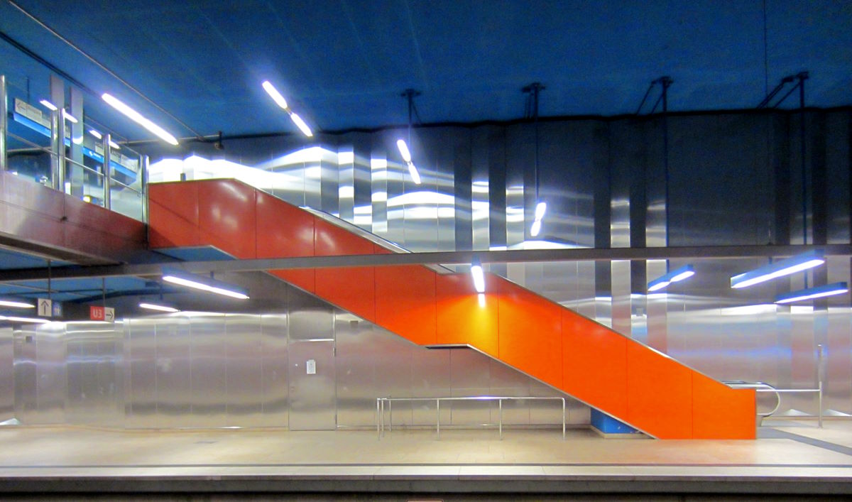 Die Hintergleiswände der 2007 eröffneten Ebene (U3) des U-Bahnhofs Olympia-Einkaufszentrum reflektieren mit hunderten von Edelstahl-Pyramiden das Licht, und das Orange steht für die U3. Den U-Bahnhof der U1 eine Etage höher gibt es bereits seit 2004.