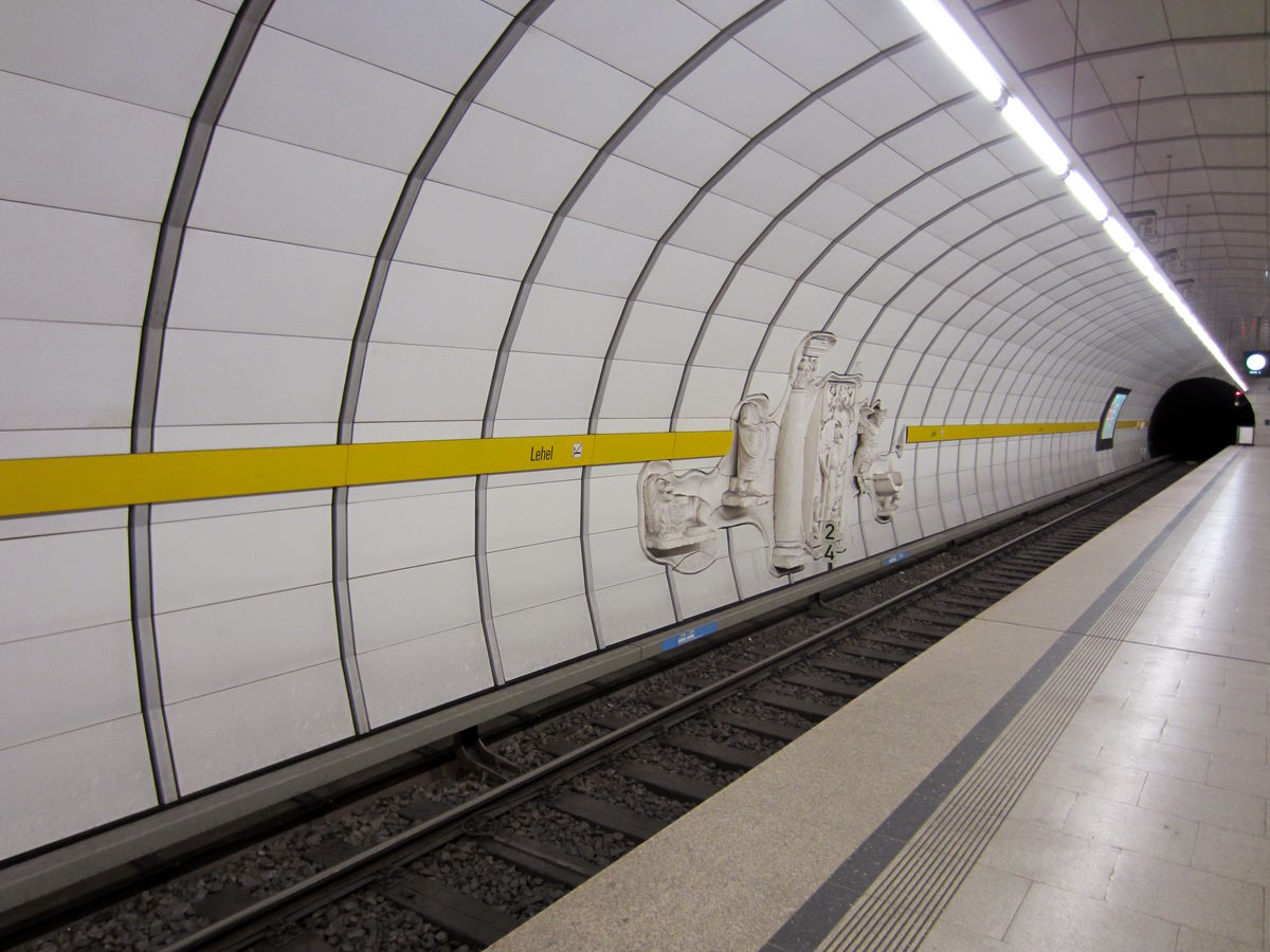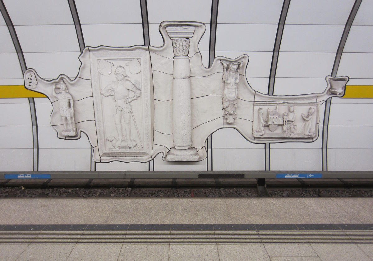 Der U-Bahnhof Scheidplatz in Schwabing wurde 1972 eröffnet und zunächst nur von der U3 angefahren. U2 / U8 kamen erst 1980 dazu. Waki Zöllner (1935 – 2015) schuf die Reliefs an den Hintergleiswänden.