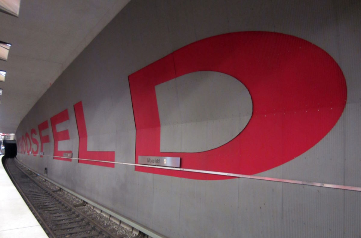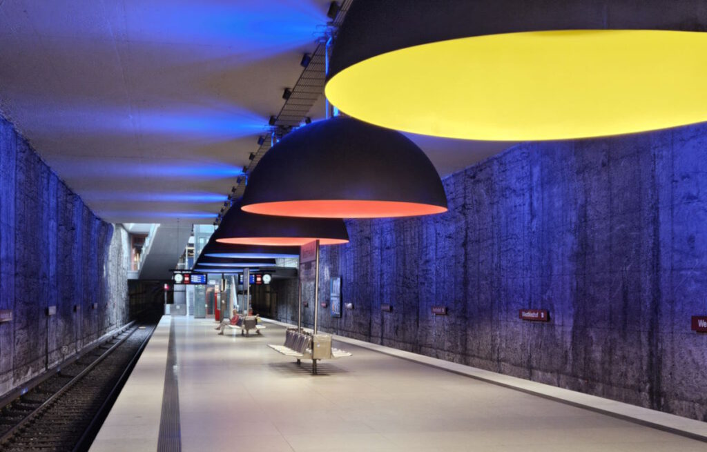Der U-Bahnhof Moosfeld im Stadtbezirk Trudering-Riem wurde im Mai 1999 eröffnet. Das Lichtkonzept stammt – wie am U-Bahnhof Westfriedhof – von Ingo Maurer (1932 ‒ 2019).