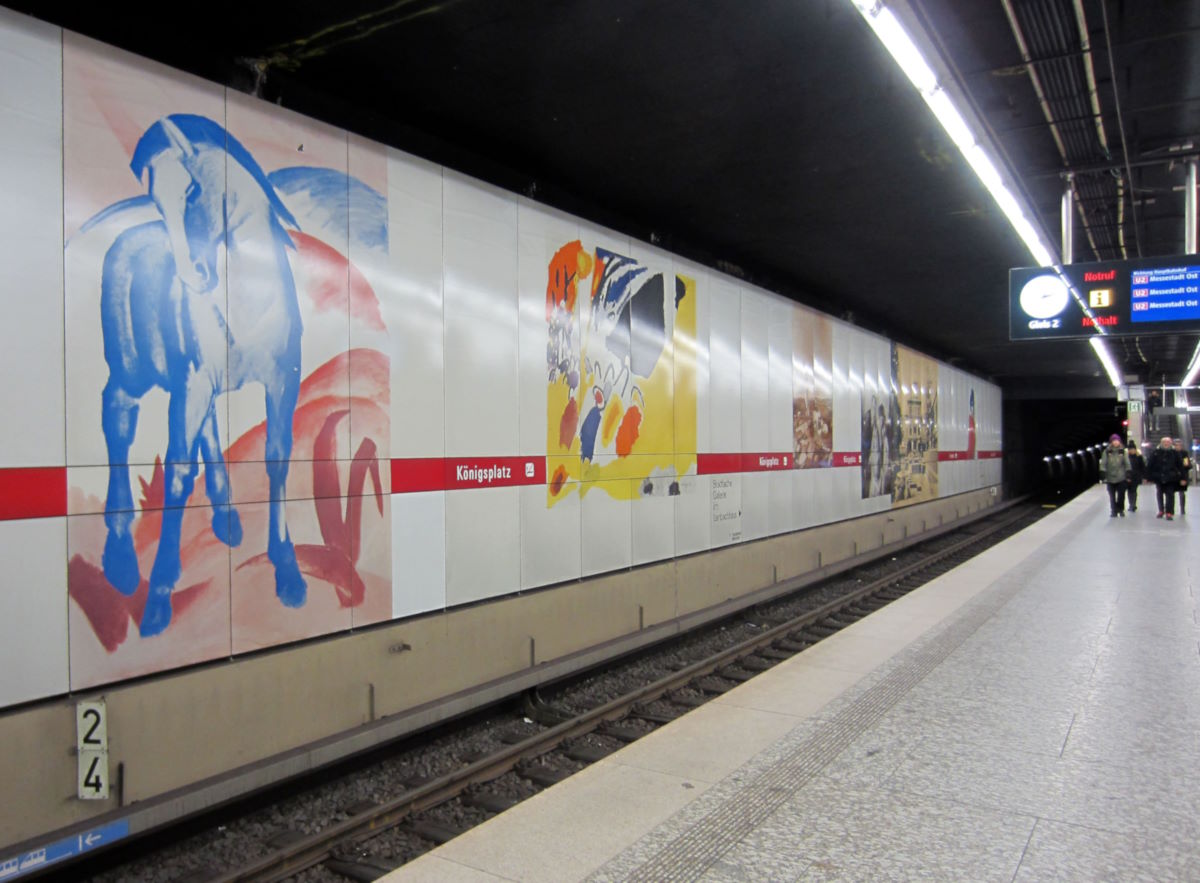 Bei der Gestaltung des U-Bahnhofs »Königsplatz« stellten Josef Wiedemann und Johannes Segieth mit 32 bis zu vier Meter hohen Abbildungen von Kunstwerken einen Bezug zu den Galerien und Museen der Umgebung her (Kunstareal). Die Vitrinen mit Exponaten aus der Glyptothek und der Staatlichen Antikensammlung wurden erst 1990 – zehn Jahre nach der Eröffnung des Bahnhofs – aufgestellt.