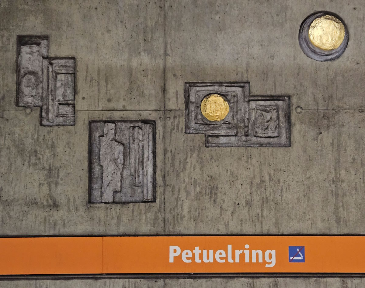 Die U-Bahnhöfe Petuelring und Bonner Platz wurden im Mai 1972 eröffnet. In die Hintergleiswände aus Rohbeton sind Reliefs der Bildhauerin Christine Stadler* (1922 – 2001) integriert.