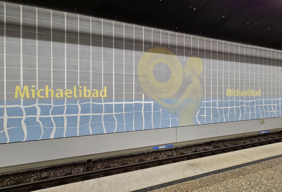 Der 1980 eröffnete U-Bahnhof Michaelibad in Perlach wurde 2022 saniert und von der MVG in Zusammenarbeit mit dem Architekturbüro Allmannwappner umgestaltet. Die Motive der Hintergleiswände verweisen nun aufs nahe Michaelibad.