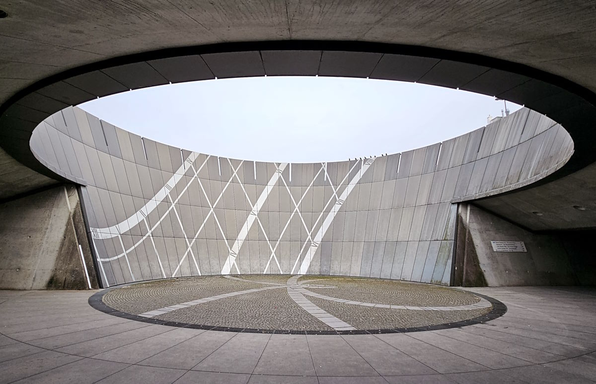 Der Zugang zur 1999 eröffneten U-Bahn-Station »Messestadt Ost« erfolgt durch den vom Bildhauer Blasius Gerg (1927 – 2007) gestalteten trichterförmigen Sonnenuhrenhof.