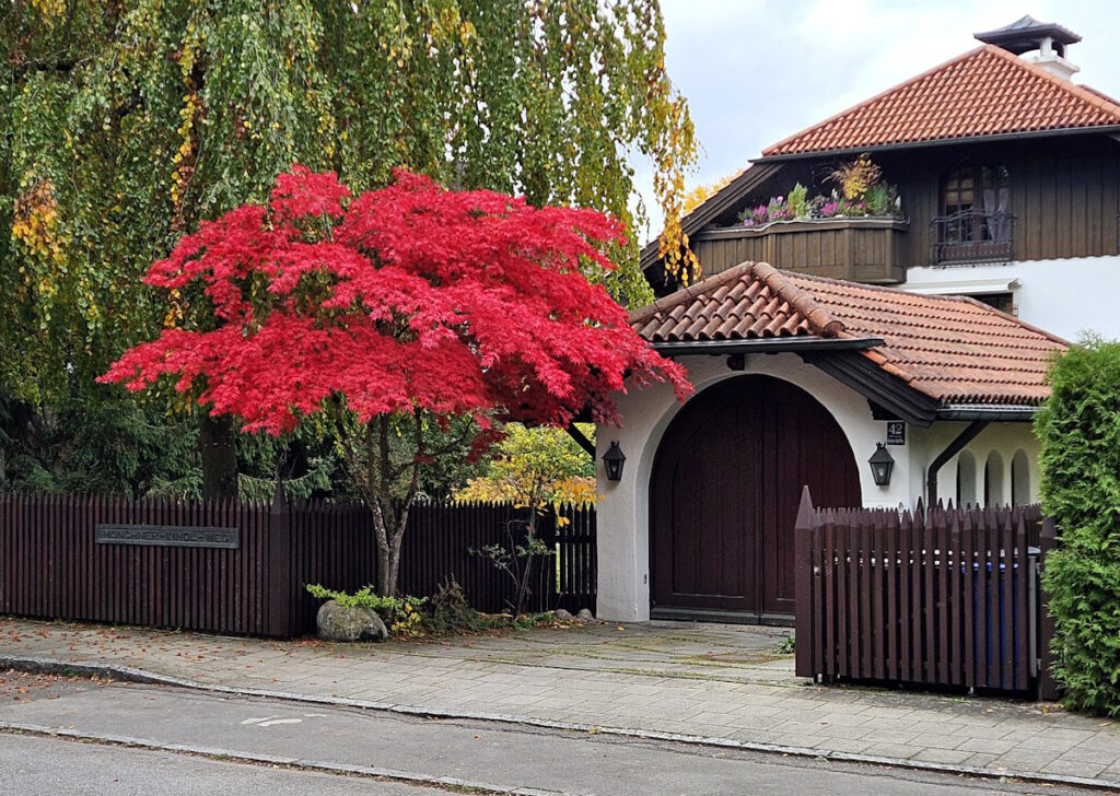 Am Münchner-Kindl-Weg in Neuharlaching leuchtete uns von weitem dieser rote Fächerahorn entgegen (Hausnummer 42).