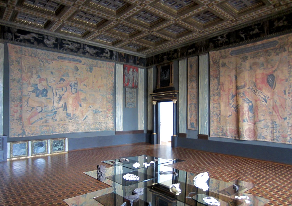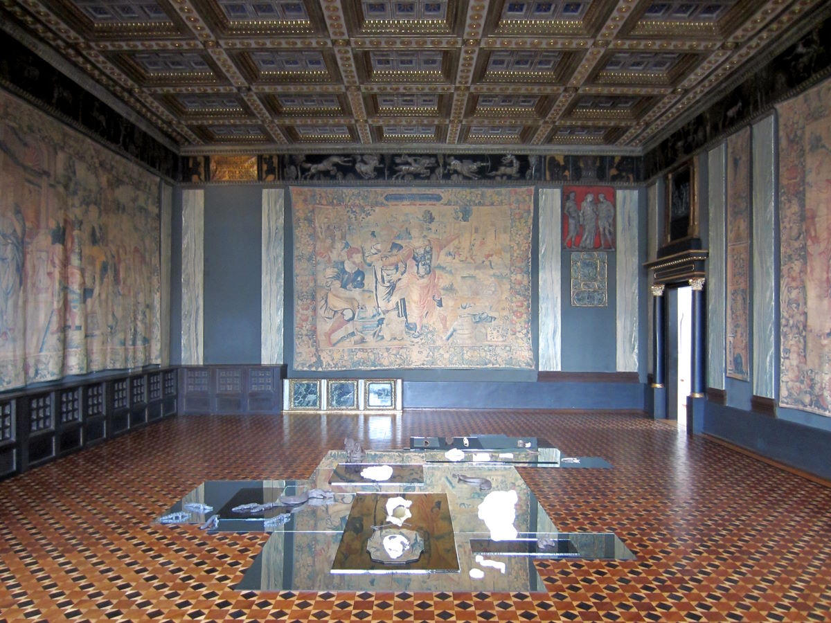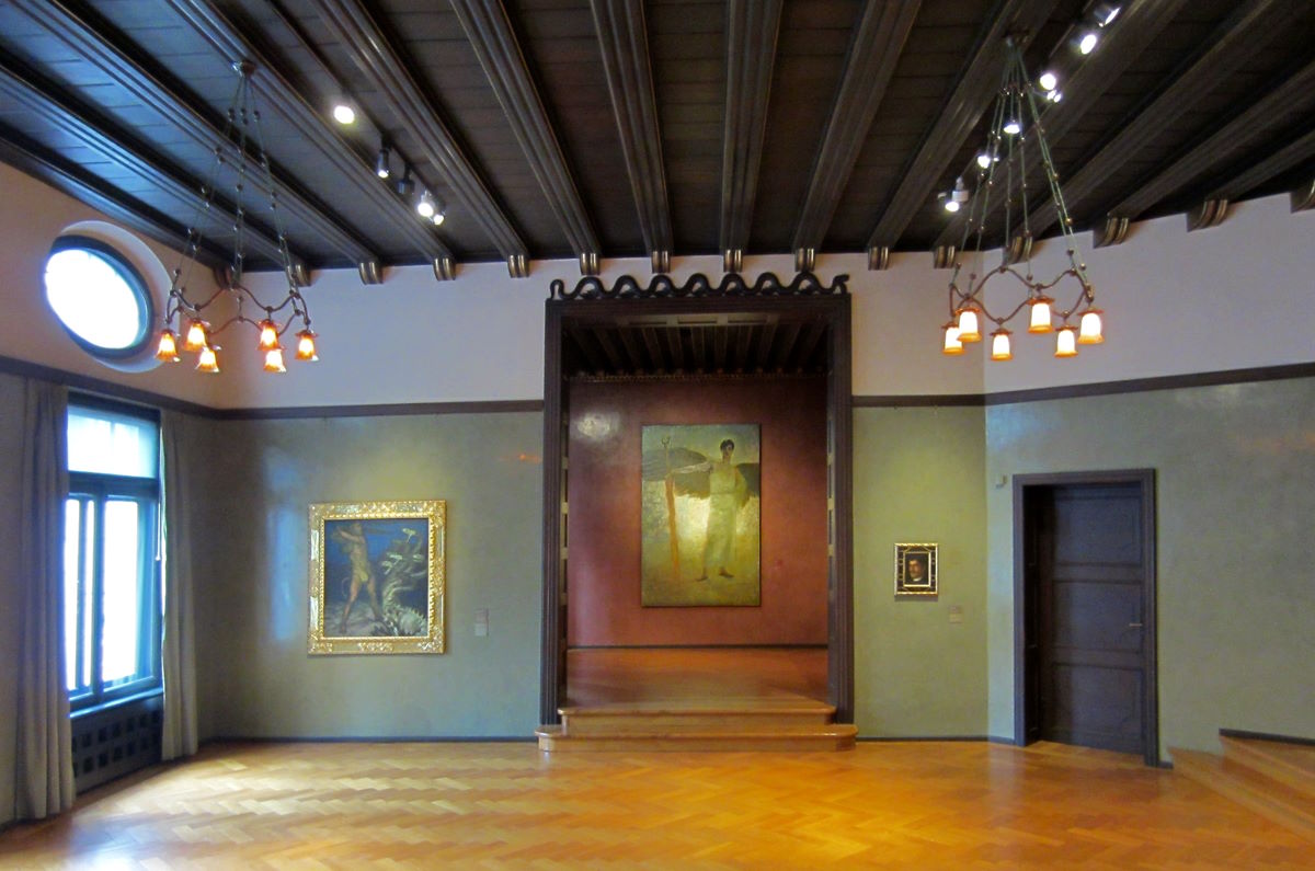 Das Alte Atelier mit einem von Franz von Stuck selbst gemalten Fries war eher ein Bankettsaal. In diesen repräsentativen Raum lud der »Malerfürst« regelmäßig Persönlichkeiten aus Kunst und Wissenschaft, Politik und Aristokratie ein. Wie auf einem Weihealtar stellte er sein laszives Gemälde »Die Sünde« aus dem Jahr 1893 aus, das wohl Anna Maria Brandmaier darstellt, die Mutter seiner Tochter Maria. (Die Brüsseler Tapisserien wurden inzwischen durch Reproduktionen ersetzt.)