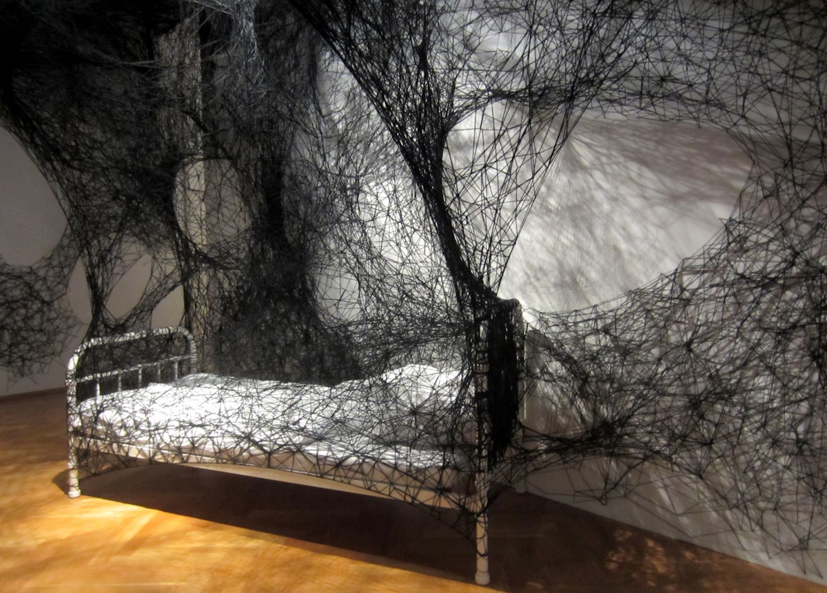 Die Installation »During Sleep« (2023) der seit 1996 in Berlin lebenden japanischen Künstlerin Chiharu Shiota (*1972) wirkt »kafkaesk«.